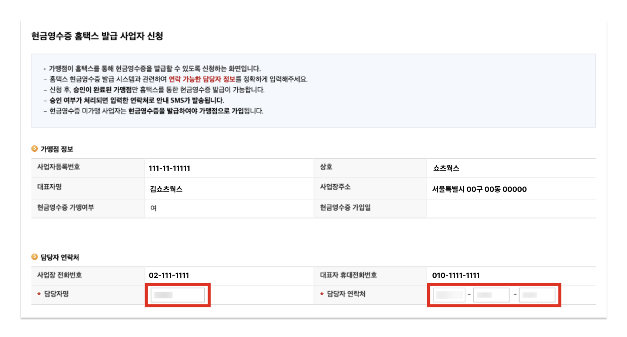 - 홈텍스 로그인 후 > 전자(세금)계산서 현금영수증-신용카드 > 현금영수증(가맹점) > 발급 > 현금영수증 발급 사업자 신청 및 수정