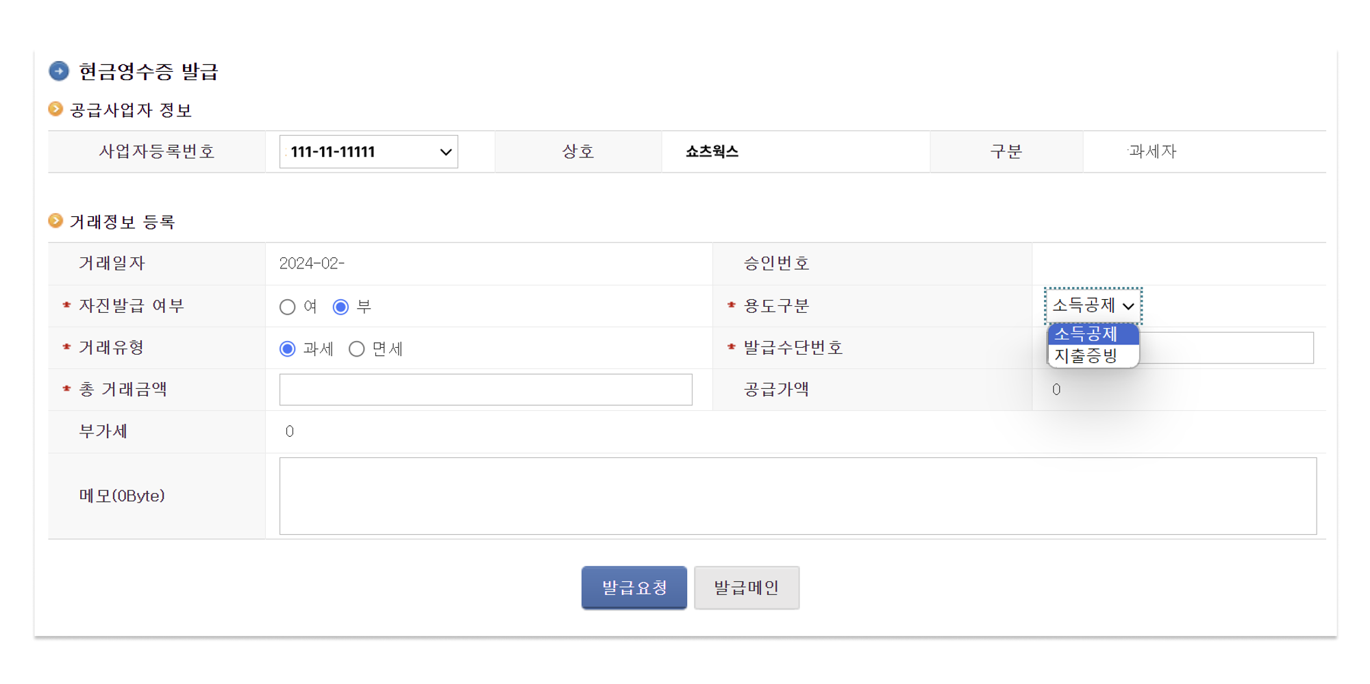 - 전자(세금)계산서 현금영수증-신용카드 > 현금영수증(가맹점) > 발급 > 현금영수증 건별 발급