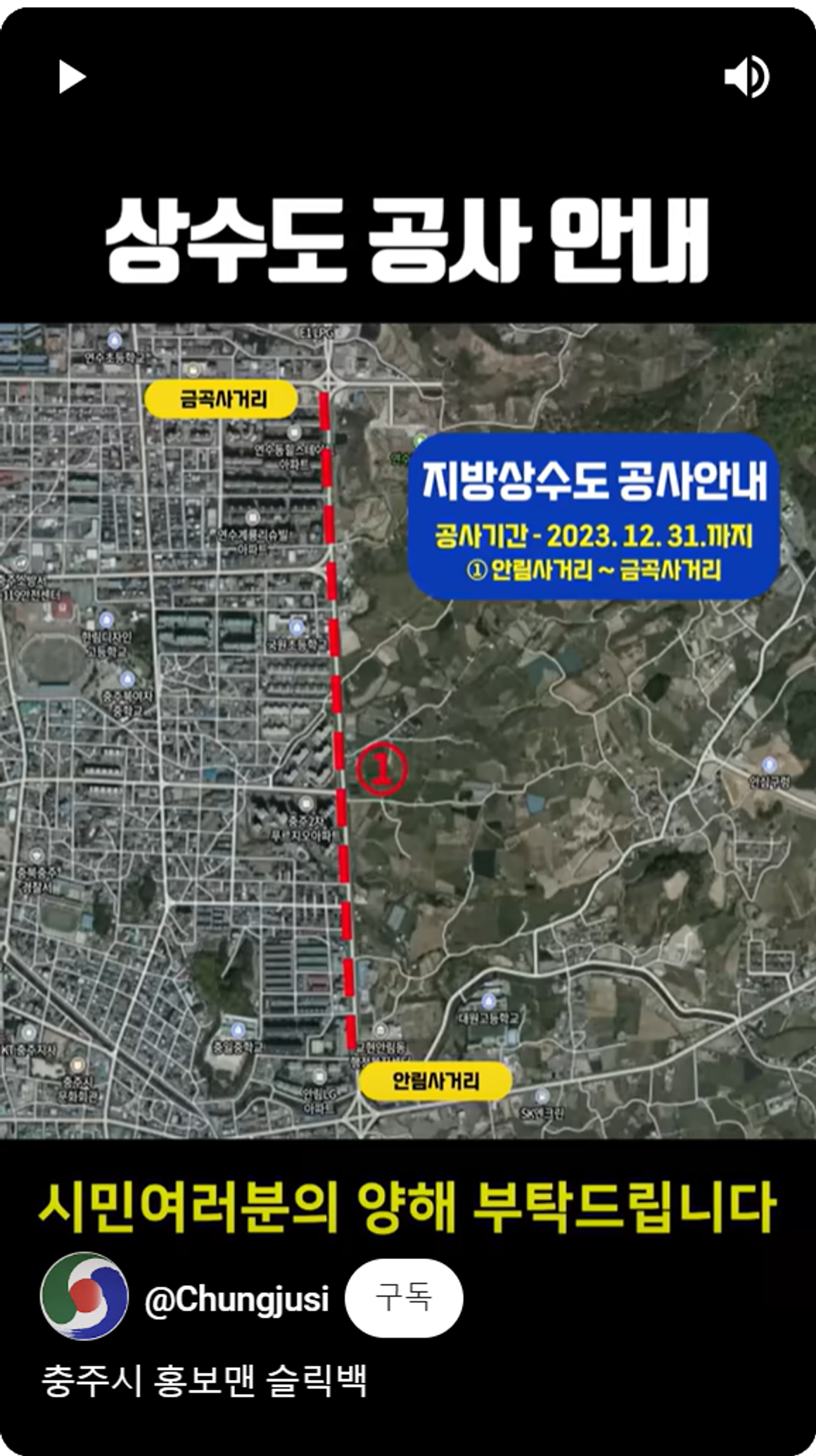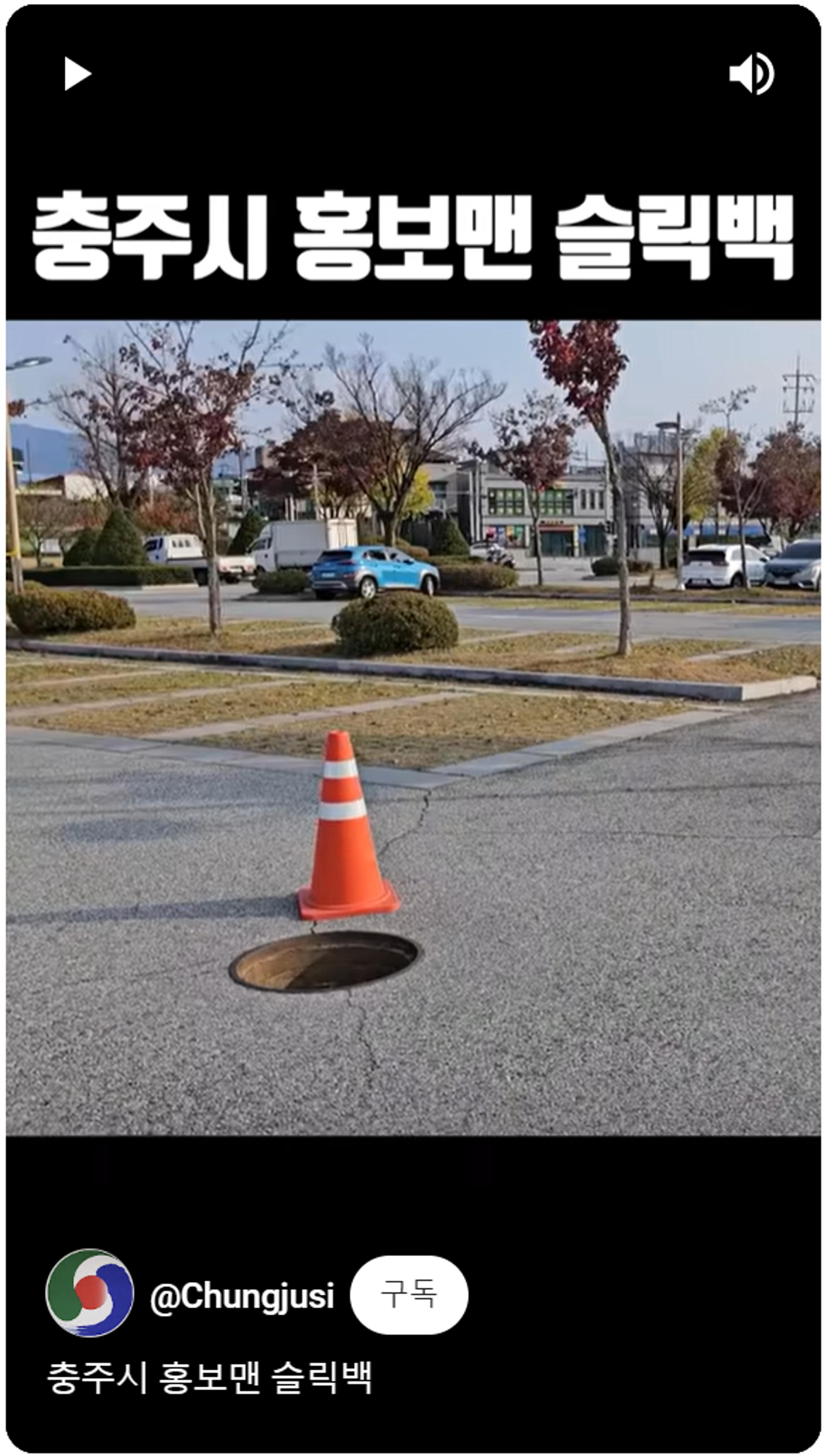 - 충주시 상수도 공사를 하니 조심하라는 안내 정보를 #슬릭백챌린지와 엮어 유쾌하게 표현