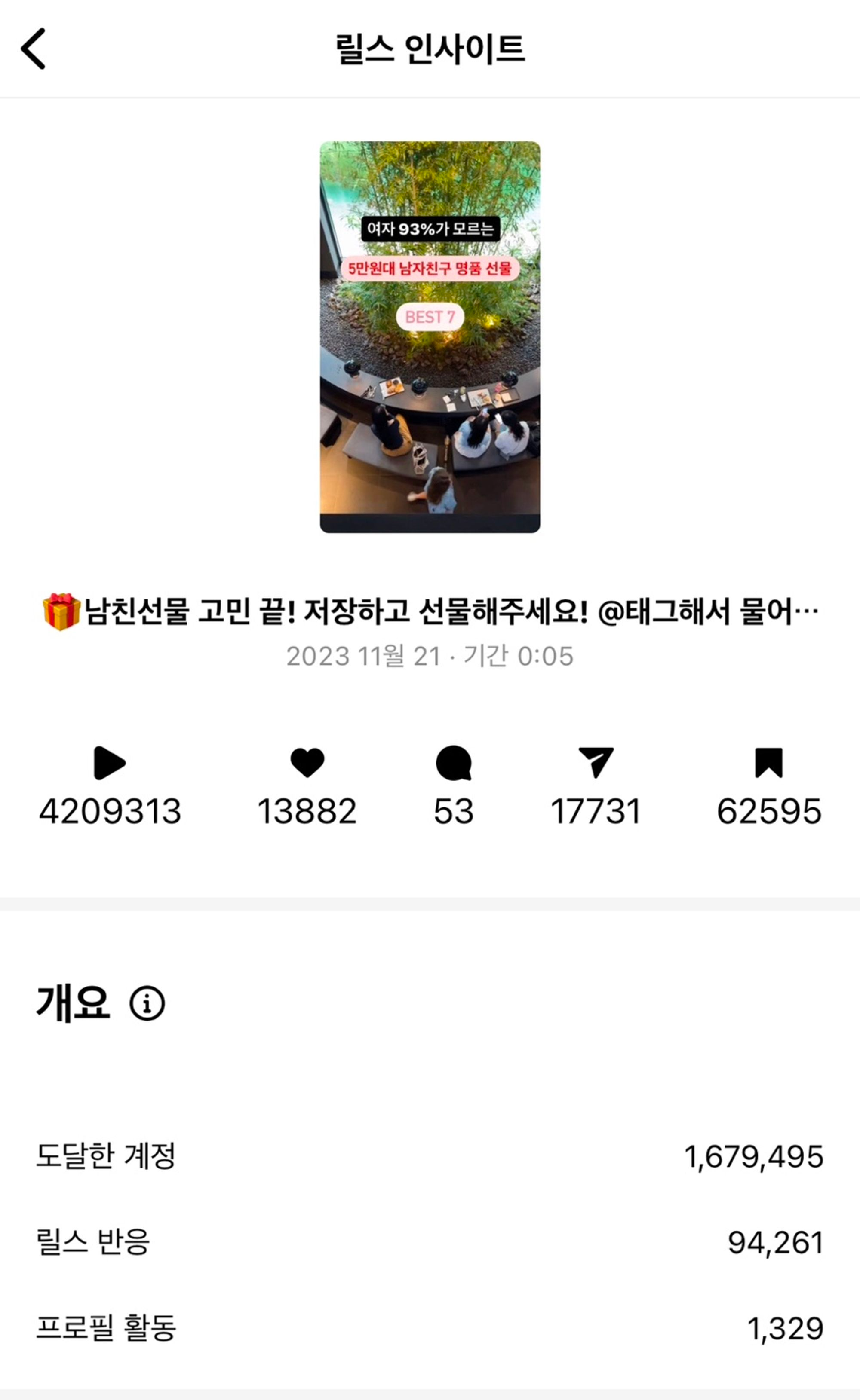 - 정보성 : 사람들의 궁금증을 자극해서 영상을 보게 만들었어요. 짧은 영상이기 때문에 사람들의 시선을 주목시킬 도입부가 성공의 열쇠예요.