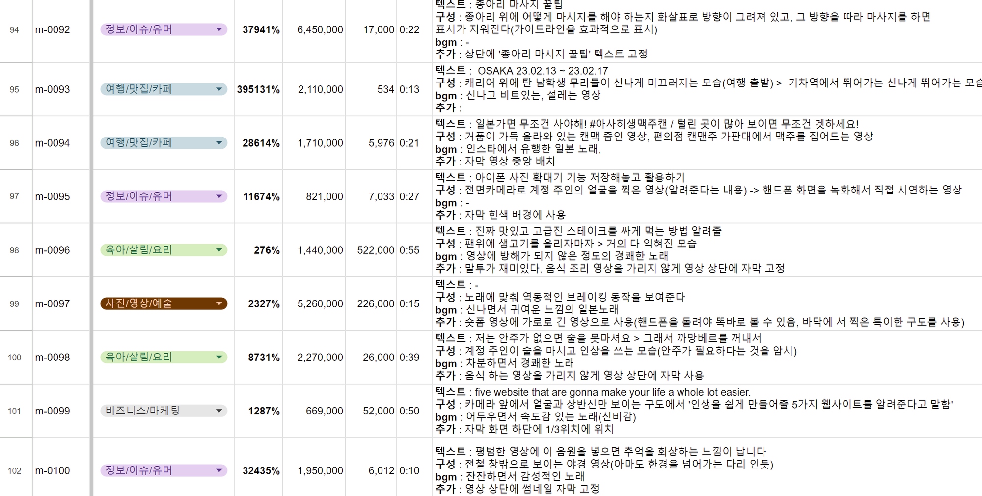 숏폼을 잘 만들기 위해서 최소 100개 이상의 릴스의 썸네일, 영상 진행, 텍스트 댓글을 분석했어요. 그랬더니 카테고리별 잘 나가는 영상들의 공통적인 성공 요소를 파악할 수 있었어요. 번호 순서에 따라서 영상을 응용해보세요.